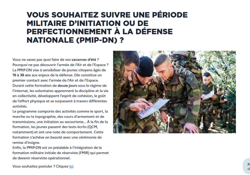 7. Apparemment les périodes militaires se tiennent en été..? C'est ce que j'ai cru trouver sur le site de l'armée de l'air, mais c'est toujours un peu compliqué de trouver des infos précises. (j'ai mis la capture d'écran ci-joint + le lien : https://devenir-aviateur.fr/une-experience-dans-larmee-de-lair-et-de-lespace ) Ce sont les PMS dont vous parlez ? Pour le retour au civil, en effet ça peut être à prendre en compte ; même si j'ai mon bac+5 comme parachute. Ceci dit je ne sais pas lequel sera le plus épanouissant, même si les trois spécialités attisent ma curiosité, ça aurait été sympa de pouvoir découvrir les métiers avant de se lancer XD Peut-être qu'au cirfa, on m'en dira + ?
