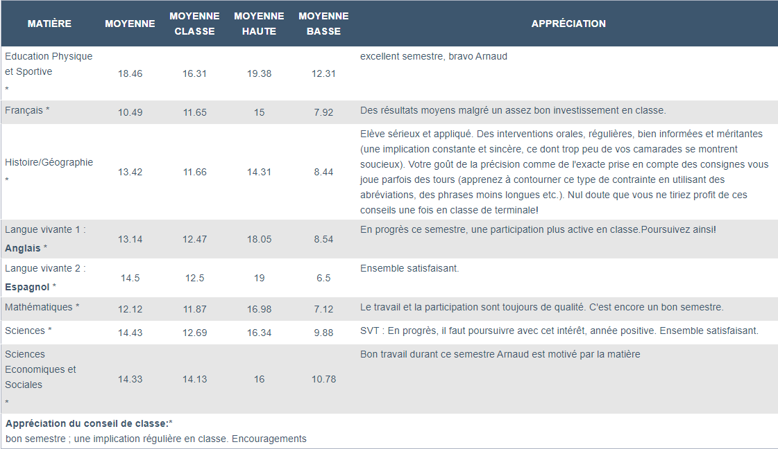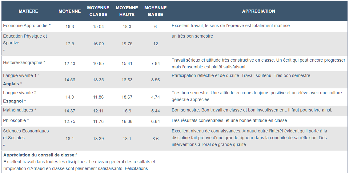 ArnaudH Posté(e) 30 mars 2018 Signaler Posté(e) 30 mars 2018 Bonsoir, Suite à mon précédent message que vous pourrez trouvez ci-dessus, je me permets de venir vers vous pour obtenir vos avis sur mon dossier de candidat au sein d'une classe préparatoire ECE. Pour faciliter la lisibilité, veuillez retrouver mes bulletins dans l'ordre : Premier semestre de 1er, Second semestre de 1er et 1er semestre de terminale. Concernant mes résultats aux épreuves anticipées les voici : - Science : 13 - Bac Français Ecrit et Orale : 12 et 16 - TPE : 15 Je vous remercie d'avance pour vos avis concernant mon dossier de candidature, Respectueusement, A.H.